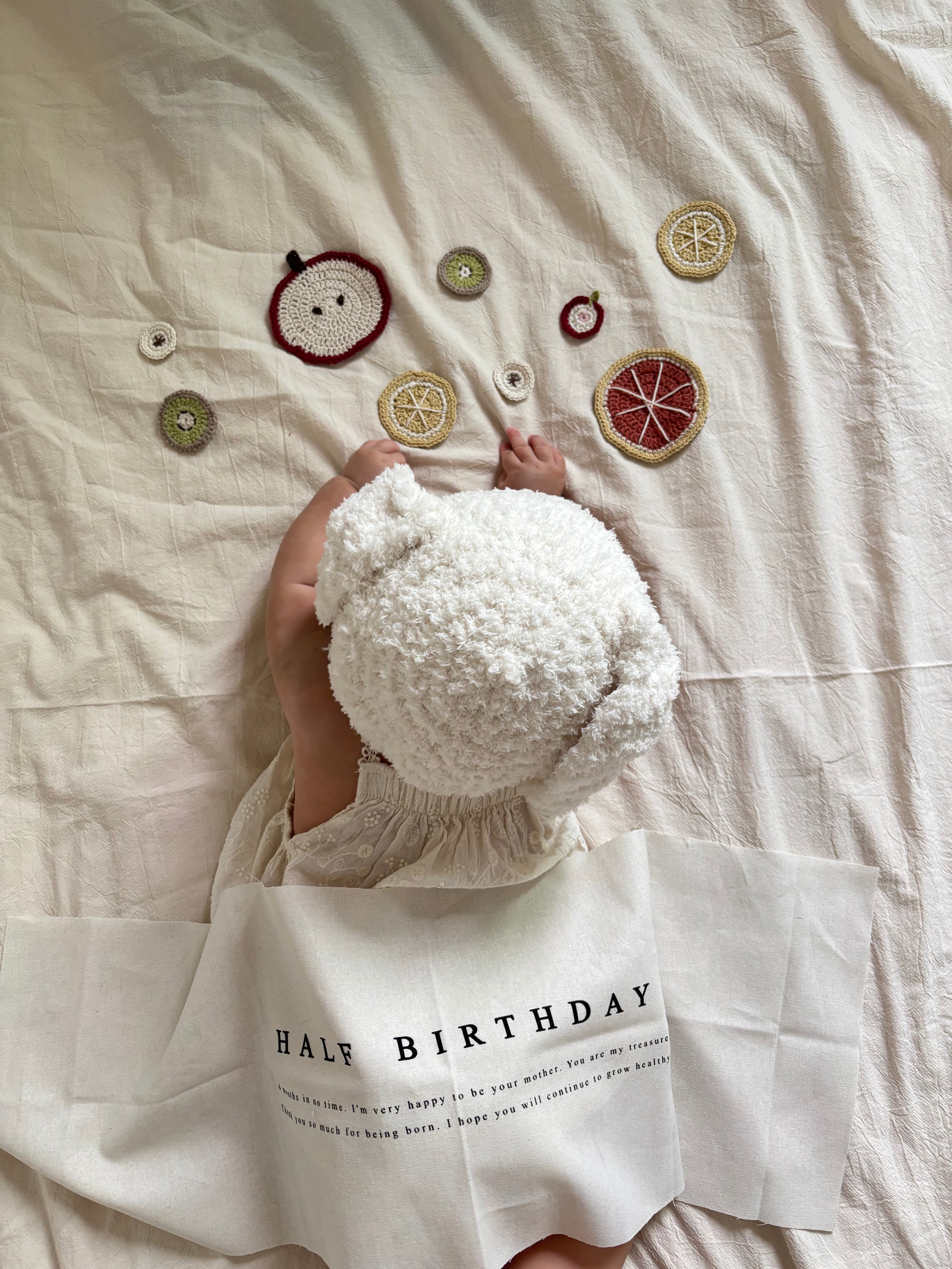 ハーフバースデーの撮影に使える、毛糸で編んだカットフルーツのセットです♡
